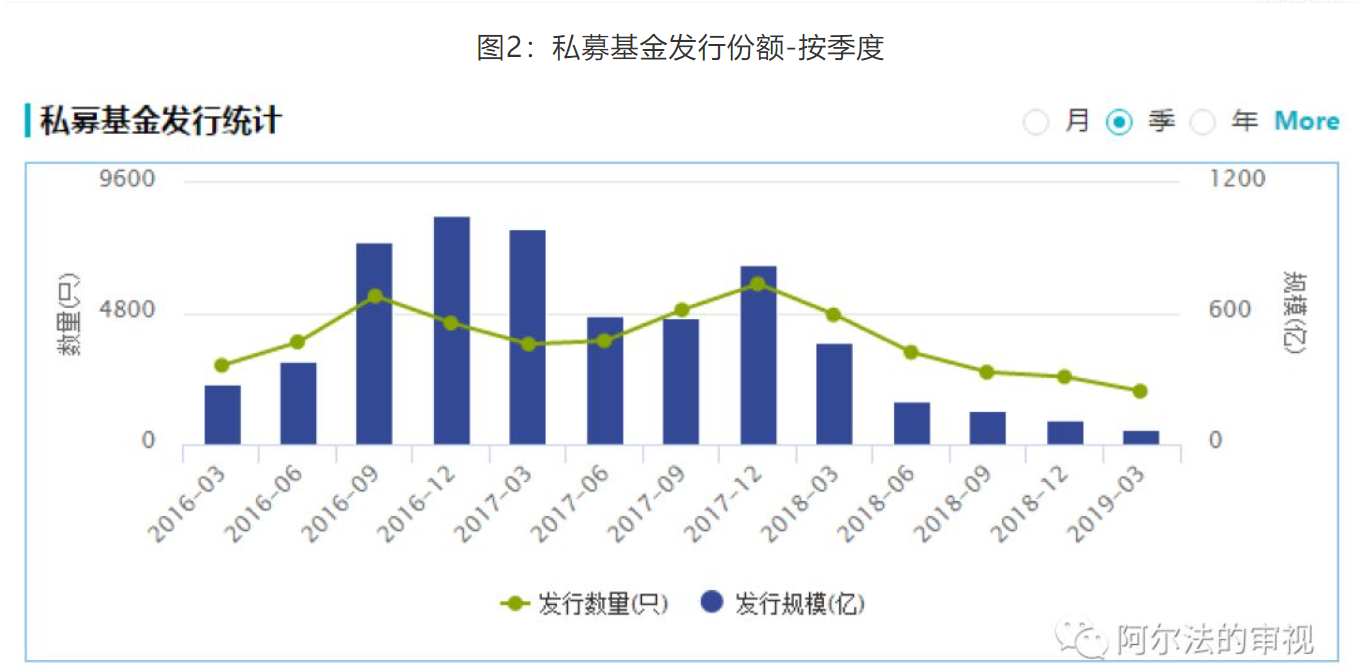 2019Q1股票型的基金发行份额仅为2018Q4的三分之一,即使排除掉春节因素,这个数据也显著的偏低了。如果深入到月度数据看,10月A股大跌至2500点左右的位置后,大量的抄底资金进入,发行规模达到500亿。但Q1呢,即使在市场最火爆的2月之后,3月的发行规模也仅有200亿不到。(说明两点:一是追高的没有抄底的多,市场越来越理性了;二是当前民间可投资的财富不如2014年)。另外,私募基金的发行规模在Q1也未见明显起色。